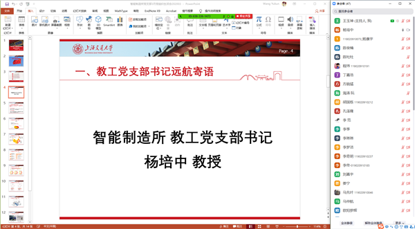 会议伊始,智能制造所教工党支部书记杨培中教授给与会党员进行远航教育。杨老师希望大家做事情持之以恒,要有国际化视野,学习先进的方法和理念,提高自己的知识储备。与此同时,不忘初心,牢记使命,善于管控时间,经常锻炼身体,继续发挥党员的先锋模范作用,谨记“饮水思源、爱国荣校”的校训,为实现自己的理想目标而不懈努力。