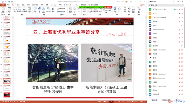 随后,智能制造所的两位上海市优秀毕业生娄宁和王强分别向与会成员分享自己的学习、科研、求职经验。娄宁同学详细介绍自己的求职过程,研一时参观钱学森图书馆,被钱老的精神所折服,并以钱老为自己的学习榜样,研二暑期参加学院举办的“翼计划”暑期实践活动,到航天科工二院进行参观学习,萌生为祖国航天事业贡献自己力量的信念,并于2019年秋招,成功签约航天科工二院。王强同学本科期间携笔从戎,报名参军,在军队中服役两年,养成遇事不拖延、有困难正面面对、不为失败找借口的良好习惯,在求职过程中,寻求个人发展和国家需求相结合,并于2019年秋招,成功签约中国航空工业集团。