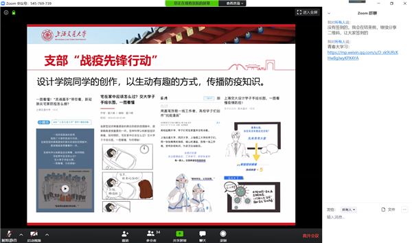 接着张航介绍了关于支部“战疫先锋行动”的活动,发挥战“疫”期间支部的作用,做好疫情防控工作,积极引领班风、学风,保障线上教学科研顺利进行。结合身边同学的具体事迹,鼓励大家向榜样学习,结合自己的特长,寻找能够贡献力量的方式。
