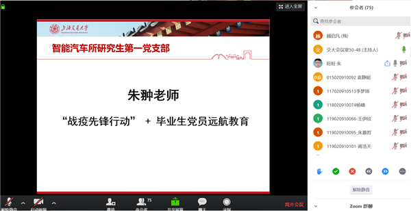 3月25日,智能汽车研究所研究生第一、二党支部通过zoom远程联合开展“毕业生党员远航教育”暨“战疫先锋行动”主题党日活动。教工党支部朱翀、学生支部指导教师陶晓红及学生支部成员出席会议,会议由智能汽车所研究生第一党支部书记朱旺旺主持。