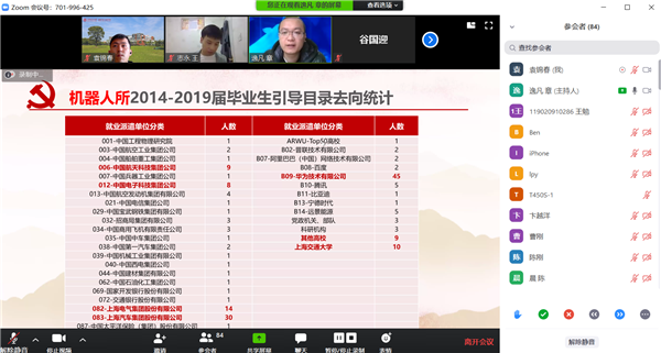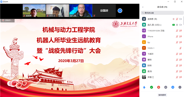 3月27日下午,机器人所研究生第一、三、四党支部通过视频会议联合召开毕业生远航大会暨“战役先锋”党组织生活会。教工党支部书记谷国迎和系所思政郭莉出席了本次会议。会议由机器人所研究生第三党支部书记章逸凡主持。