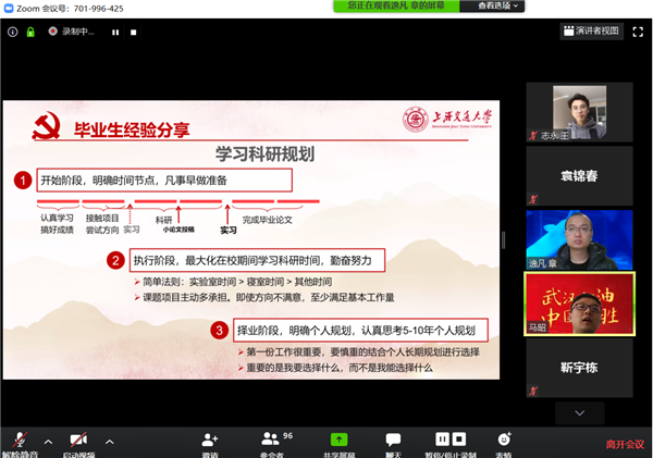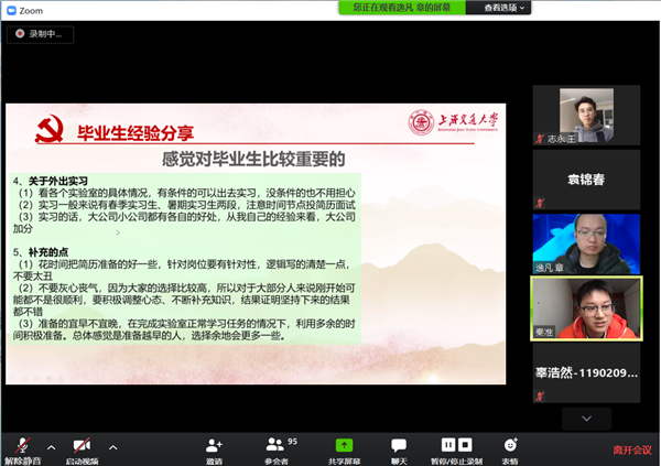 接下来,几位毕业生代表分享了他们在研究生期间学业、科研和就业方面的经验。博士生周宇认为科研无捷径,切勿盲目追求“风口”,科研工作质量过硬最重要。硕士生马昭强调学习科研规划的重要性,合理利用时间往往使人处变不惊。靳宇栋从求职申请,知识准备,面试细节等方面分享了寻找互联网工作满满的“干货”。陈镇枫指出无论是科研还是找工作,与人交流讨论十分重要,在团队中比孤军奋战更加有效率。梁志栋认为坚持自己的理想有时需要做出一定的牺牲,但重要的是要明白自己想要成为一个怎样的人。