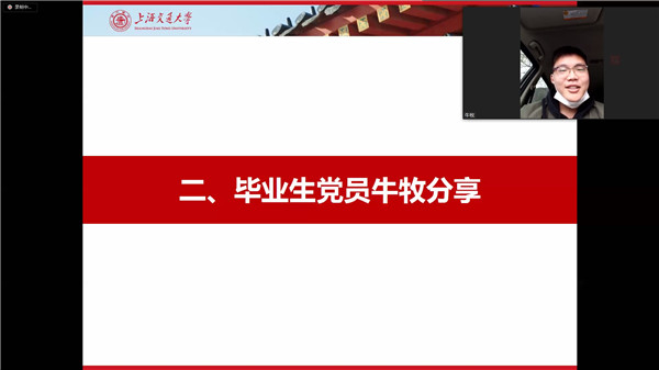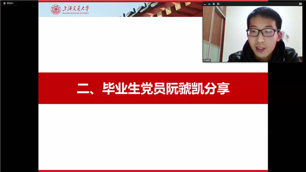 会议第二项为毕业生党员分享,阮虢凯分享了自己硕士在读期间的一些生活经历,他表示这期间自己最大的收获就是结交了许多的朋友,在学习和生活中,大家相互扶持,一起解决问题,给自己的研究生生涯增添的许多色彩。