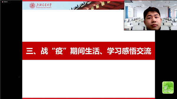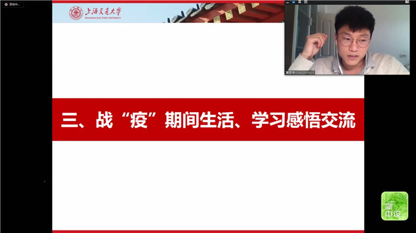 会议最后一项议程为战“疫”期间生活、学习感悟交流。同学们积极互动发言,硕士生党支部高强同志和大家分享了居家学习的一些感悟,他表示虽然家里没有学校那样的氛围,但有着充足的学习资料和相对独立的空间,我们应该克服困难,调整心态,积极适应这个阶段。博士生党支部黄哲伟和大家分享了自己日常作息安排,他建议大家在安排好科研工作的同时也要加强体育锻炼,并分享了自己健身的一些心得,他强调健身也是一门科学,要认真去对待。