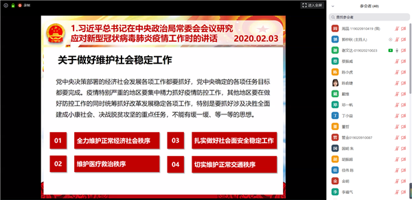 会议第一项,谢文达带领大家学习了抗击新冠疫情会议上习近平总书记的讲话精神。面对严峻疫情,习近平总书记在做好疫情防控重点工作、维护社会稳定、宣传教育和舆论引导以及保持经济平稳运行四个方面对抗击疫情工作提出了指示和要求。对疫情形式下的经济社会发展,习近平总书记指出在确保疫情防控到位的前提下,需变压力为动力,有序恢复生产生活秩序,强化“六稳”举措,加大政策调节力度,加强党对统筹推进疫情防控和经济社会发展工作的领导,团结全党全军全国各族人民的力量,共同战胜疫情,实现决胜全面建成小康社会、决战脱贫攻坚的目标任务。