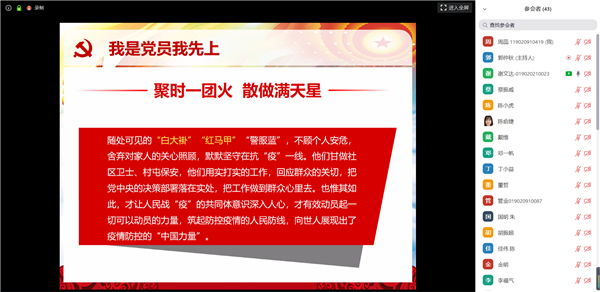 随后,全体党员就中国在抗疫过程中体现的制度优势以及党组织和党员在落实重大任务中发挥战斗堡垒和先锋模范作用进行了交流。中国强大的制度动员能力,制度协调能力和制度组织能力在抗击疫情战争中起到了至关重要的作用,充分体现了中国特色社会主义“集中力量办大事”的制度优势。聚是一团火,散做满天星,广大党员在共产党的领导下不忘初心,牢记使命,积极投身疫情防控一线,以共产党员的先锋模范作用凝聚广大人民群众,向世人展现出了疫情防控的“中国力量”。