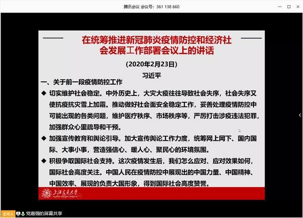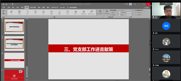 思政教师陈旦玥最后进行了总结发言。她肯定了各组对分享发言的认真准备和全情参与,鼓励更多同学积极表达。她表示,这次疫情给了九零后的同学近距离深刻感知国家制度优越性和民族文化精神的窗口,未来国际形势依旧严峻,党员同志任重道远,也希望下一届党支部继承传统、改进不足,帮助制造所全体党员共同进步。