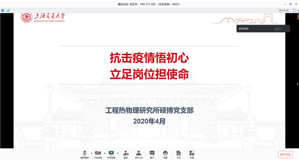 4月22日,为深入学习贯彻落实习近平总书记关于疫情防控工作的重要讲话精神和重要批示指示精神,引导党员同志充分感悟在抗击新冠疫情期间展现出的国家制度优势,充分发挥学生基层党组织战斗堡垒作用和党员先锋模范作用,工程热物理研究所硕士生、博士生党支部采用线上形式开展“抗击疫情悟初心,立足岗位担使命”主题组织生活会,系所思政老师徐德辉出席了本次会议。