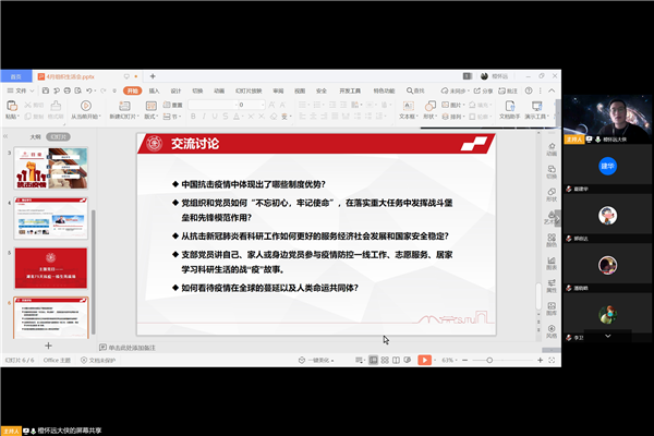 在交流发言环节,硕士生党支部郭容达说,抗击疫情已经取得了阶段性的胜利,中国已经度过了最困难的时期,这次疫情充分体现了中国政治制度和社会制度的优越性,全国上下集中力量办大事,不同岗位的人民听指挥有原则,党员冲锋在前,正如习近平总书记所说,疫情阻击战是一场人民战争,我们要坚持党的领导,积极发挥党员的先锋模范带头作用。