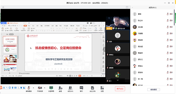 4月20日下午,核科学与工程学院硕、博党支部通过视频会议形式召开“抗击疫情悟初心,立足岗位担使命”主题组织生活会。核科学与工程学院思政教师徐德辉以及支部成员参加了本次会议的学习与讨论。会议由核学院硕士生党支部书记程怀远主持。