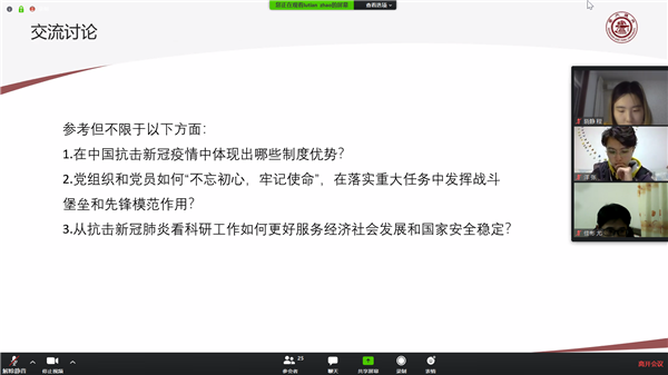 最后,指导老师徐德辉进行了总结发言,老师说通过这次疫情,我们能够看到中国共产党在自我纠错、自我革新方面的先进性,能够提升我们的道路自信、理论自信、制度自信和文化自信,但是作为一名研究生,关注国际形势的同时也不能整天忧心忡忡,止步不前,工作的重心仍然应该放在科研工作上,为返校后的工作做好准备。