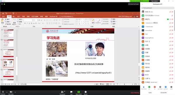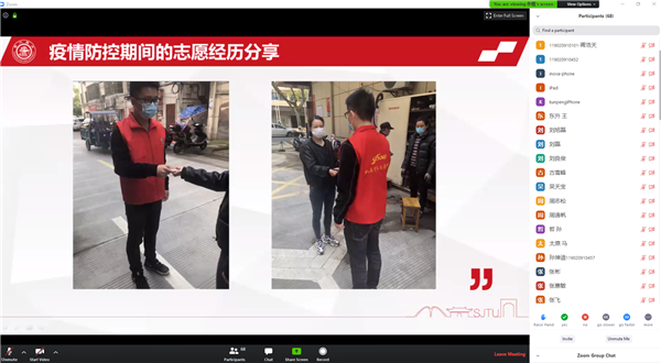 接着,全体同学集体观看了抗击疫情英雄们的《战“疫”故事》。通过在线学习,同学们深深感受到了战疫英雄的坚毅、责任和担当,他们甘于付出,舍小家为大家的精神值得青年学子永久铭记和学习。支部也邀请了余慨同学分享自己参与社区疫情防控工作的志愿者经历。小区封闭式管理、疫情防控知识宣传、居家隔离人员管理,防控工作任务繁重,要求细致,余慨同学通过自己的坚持和用心,协助社区开展疫情防控工作,体现出交大学子的责任和担当。