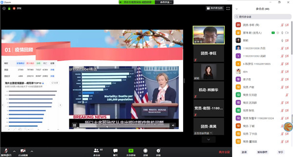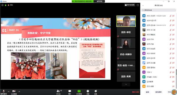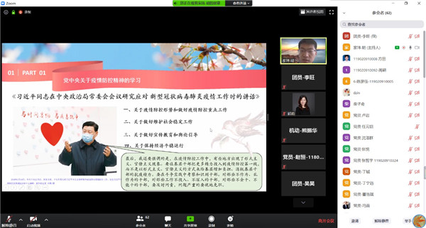 在本项内容的最后,胡家玮组织学习了《习近平回信勉励北京大学援鄂医疗队全体“90后”》一文。作为高校学生,首先要做到对自身健康的责任,做好防护措施,避免感染,在家自觉参加线上学习以及文献阅读。其次要尽到对社会的责任,不扎堆,不聚众。胡家玮还特别提醒大家要每天按时提交健康问卷,为后续返校做好准备。