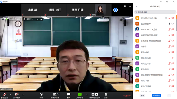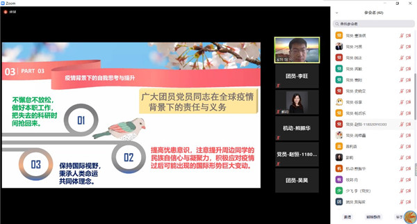 会议的最后,班主任熊振华对本次会议进行了总结。他希望同学们在家要坚持科研,虽然无法进行实验,也可以进行理论研究。目前上海市已经开始安排有序的复学,尽管上海市防控做的非常到位,但仍然存在潜在的风险。熊振华要求大家做到两个“自律”:要做好防控措施,按时提交身体健康调查表,对自己负责,对社会负责;要紧抓科研任务,不因为疫情而延误进度。接着,思政老师郭莉介绍了学生返校的安排,对于疫情影响导致的就业形势严峻问题,她建议毕业年级学生更多选择国家重点行业以及基层就业。最后,在4月23日这个世界读书日,郭莉希望大家多阅读、多思考自己的职业规划,为实现全面建成小康社会做出自己的贡献。