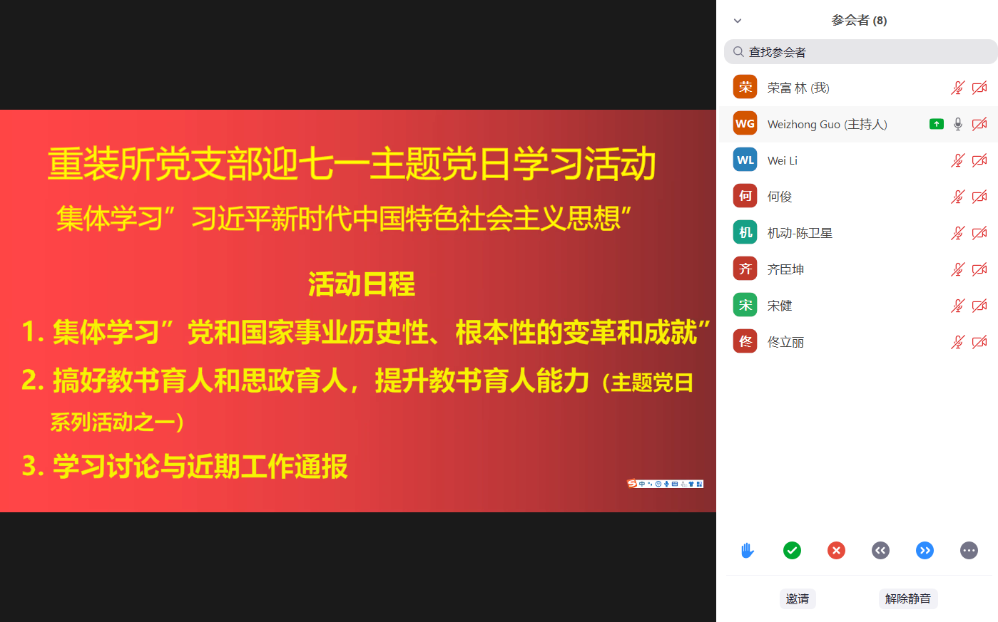 6月30日,重大装备设计与控制工程研究所党支部线上开展“迎七一”主题党日学习活动。
