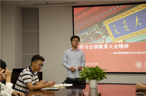 10月9日,核学院硕博联合党支部在机械楼F210开展了“学习全国教育大会精神”主题组织生活会。会议由博士生党支部书记赖平主持,核学院思政老师余天佐出席了本次组织生活会,硕博联合党支部的党员和部分积极分子参与了本次会议的学习和讨论。