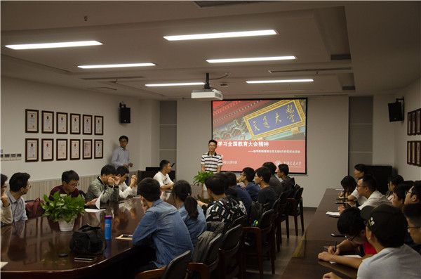 为了加深与会同学对习近平总书记讲话精神的理解,赖平将教育大会精神与热点时事相结合,围绕五个话题展开了专题讨论。同学们纷纷针对生活中身边的所见所闻以及时事热点,进行了积极热烈的交流。博士生党员王凡表示,作为一名接受过高等教育的学生,不管身处何地,身居何职,都要有自己的道德操守,切不可做违法违纪之事。博士生夏建华表示,所谓“身正为范”,教师自身思想道德水平对学生价值观的培养至关重要。不断提升师德水平是立德树人的关键,身为教师更不能做违规违纪之事。硕士生黄波分享了其同学在新疆支教的故事,并对什么是真正的为教育事业做奉献表达了自己的认识和看法。入党积极分子胡真认为,从事教育事业和做科学研究是相通的,不能名利至上、追逐热点;要向黄旭华、彭士禄老先生学习,板凳甘做十年冷,要担得起寂寞和平凡,把力量贡献到祖国最需要的地方去。同学们纷纷对教育的立德树人使命和对学生思想价值观的引领表达了自己的观点和看法,讨论活动收获了热烈的反响。