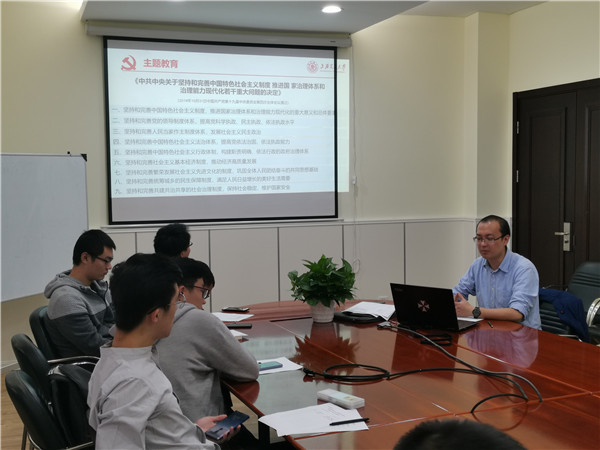 接下来,章逸凡带领与会党员共同学习了四中全会精神,并要求全体党员同学认真学习《中国共产党党员教育管理条例》,在今后的科研生活中更加严格要求自己,不断提升党性修养与为人民服务的本领。