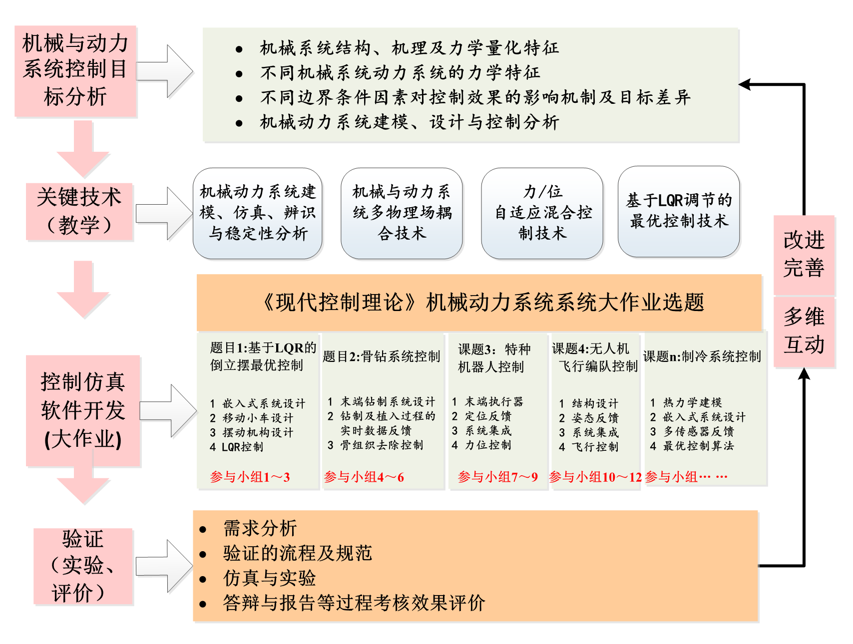 项目针对《现代控制理论》线上教学内容的多元化、教学方式的互动性不足、教学的实践性不强、前沿知识与理论方法更新速度快给教学带来的挑战、快速学习以及团队协作能力不足等问题,构建了具有“机械与动力控制特色”的线上“教学-实验-作业-评价”的教学体系,完善了线上仿真实验平台,开发了前瞻性的课程大作业团队协作体系,打通了理论讲授到技能培养的优化路径;探索并实践了“建构主义-多元智能-成功智慧”与“多维互动”结合的“多元融合”教学法,达到了学生系统知识快速构建和技能快速转化效果;针对机械与动力系统控制的背景需求,出版了《机电控制技术导论》与《控制理论基础》,引进翻译了《机械电子学》,并被多所高校遴选为课堂教学首选教材;锻炼了课程教师队伍,实现了学生“听得懂,学得会,做得好”的实践效果。