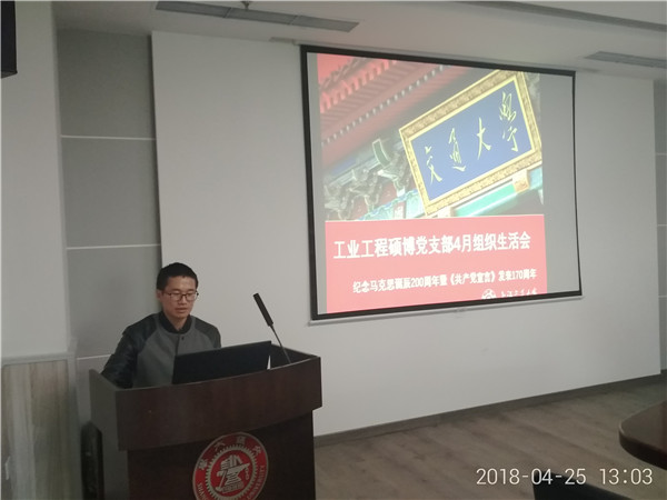 4月25日下午,365英国上市公司官网工业工程系硕博党支部在机动学院F210召开了4月份的组织生活会。生活会主题为“纪念马克思诞辰200周年暨《共产党宣言》发表170周年” ,会议由支部书记殷亚祥主持。