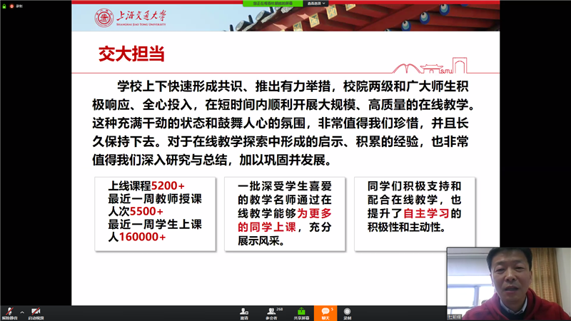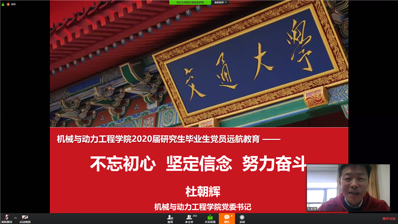 杜朝辉以“不忘初心,坚定信念,努力奋斗”为主题,为毕业生上了一堂生动的党课。他以医护工作者在一线抗击疫情、师生开展在线教学以及学生党员担任疫情防控志愿者等事迹,阐释了交大担当,进而解读了中国共产党人的初心和使命。谈到新时代的奋斗目标时,他提到,今年将全面建成小康社会,实现第一个百年目标;在2035年,实现社会主义现代化,正是这一代年轻党员建功立业,发挥才干的好时机。他带领党员重温“四讲四有”、“四个合格”以及党章中的八项义务,提醒党员在党言党,提高党员意识,做合格党员。他讲述了人民科学家钱学森学长最激动的两件事、林忠钦校长等一大批教师努力工作为学校争得的荣誉、以及易培云副教授的成长励志故事等,激励同学们志存高远,踏实工作,立足专业,大有作为。他希望各位毕业生党员牢记“饮水思源,爱国荣校”的校训,在各自的岗位上不断努力,为行业和国家发展做出新的贡献。