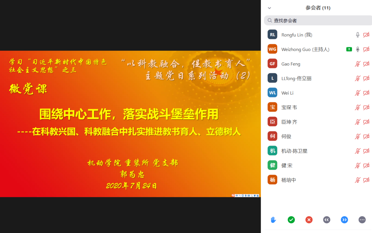 7月24日,重大装备设计与控制工程研究所党支部线上开展了集体学习“习近平新时代中国特色社会主义思想”系列主题党日活动,党支部书记郭为忠讲微党课,学院党委委员杨培中列席指导。