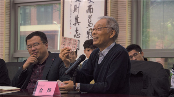 金烨首先从个人的衣食住行方面,对比了改革开放前后的巨大变化。他说,改革开放以前以及改革开放初期,人们的穿着还是单调的灰色黑色,到现在衣物已经是各式各样;改革开放以前粮食短缺,要按计划供应,到如今吃饭问题已不再困扰绝大多数人,为此,他还专门向同学们展示了自己所使用过的粮票;以前上海的交通还不便利,如今地铁网络已经四通八达。金烨老师以自己的亲身感受,讲述了计划经济时代人们的生活现状和当前人们所享受的繁荣发达的社会环境,同时也让同学们认识到了改革开放为中国带来的巨大变化。