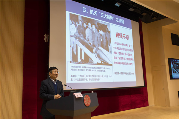 孟光以“中国航天与航天精神”为主题,从“为什么要搞‘两弹一星’”、“中国航天文化核心内容”、“航天‘三大精神’的精髓”以及“中国航天成功的原因”四个方面分享了他对中国航空航天精神的理解和感悟,同时也向同学们介绍了中国航天事业发展历程。