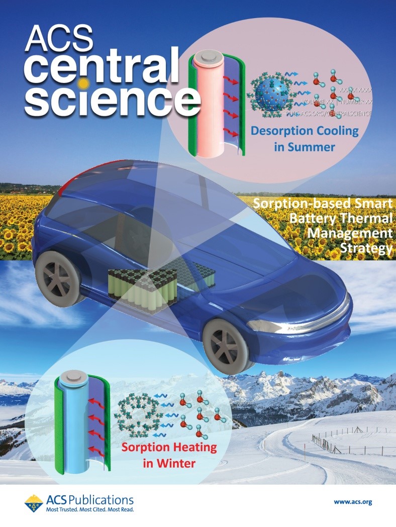 近日,制冷与低温工程研究所(以下简称“制冷所”)王如竹教授和李廷贤副教授领衔的能源-空气-水ITEWA创新团队(Innovative Team for Energy, Water & Air)在能源化学领域期刊ACS Central Science上发表了题为“Near-Zero-Energy Smart Battery Thermal Management Enabled by Sorption Energy Harvesting from Air”的交叉学科研究论文,首次提出了从环境空气中捕获能量实现近零能耗、高能量/功率密度的自适应智能型电池热管理新思路,阐述了基于水蒸汽吸附材料“脱附散热-吸附加热”的电子器件热管理机制,筛选并制备了适用于电池热管理的多孔有机金属骨架(MOF)/泡沫碳高导热复合吸附材料,验证了该智能型电池热管理策略用于电池全年候运行时夏季散热、冬季预热的可行性。论文第一作者是制冷所博士研究生许嘉兴、晁京伟和李廷贤副教授,通讯作者是李廷贤副教授和王如竹教授。该文入选ACS Central Science期刊封面论文。