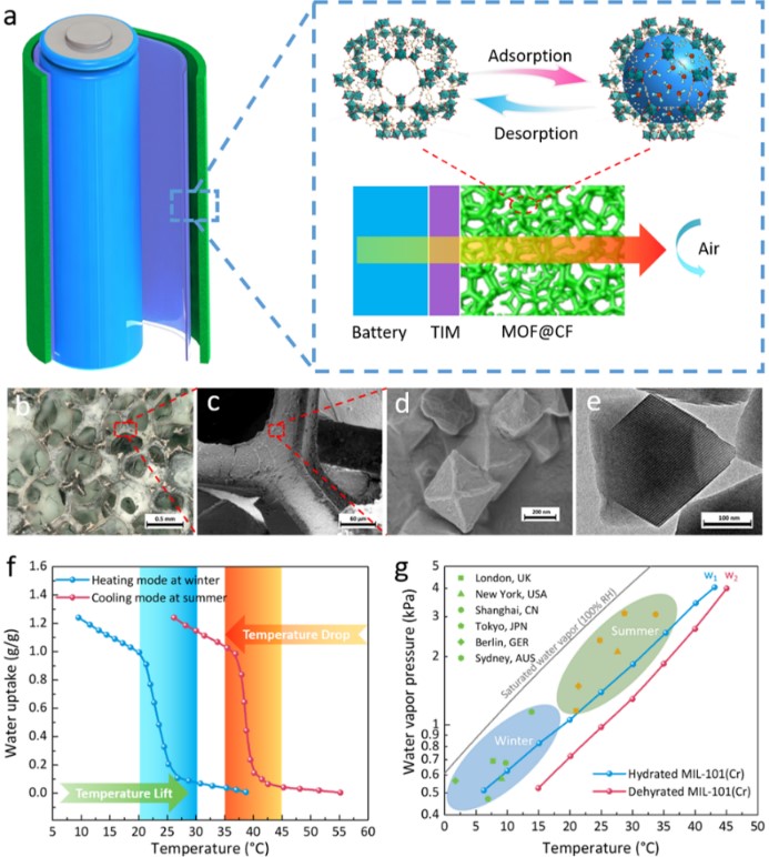 ITEWA创新团队针对现有电池热管理技术的不足和难点,提出了一种新型的基于水蒸汽可逆吸附-脱附过程的智能型电池热管理策略,采用MIL-101(Cr)多孔MOF材料与环境空气中的气态水作为工作介质,利用MOF材料在吸附或脱附水分子过程中的放热与吸热效应分别实现对电池的散热与加热。夏季电池散热模式:电池停止工作或低功率运行阶段,MOF材料吸附捕捉空气中的水蒸汽并存储在孔内;当电池高功率运行时其温度上升达到材料脱附温度后触发水蒸汽解吸,释放的高焓值气态水蒸汽将热量散至环境中实现对电池的降温。冬季电池预热模式:电池启动前干燥的MOF材料从环境空气中吸附水蒸汽,利用释放的吸附热实现对电池的预热;当电池高功率运行或充电阶段利用其自身产热驱动MOF材料的内部水蒸汽释放,脱附完全的MOF材料与空气隔绝实现能量的储存以备下次循环使用。