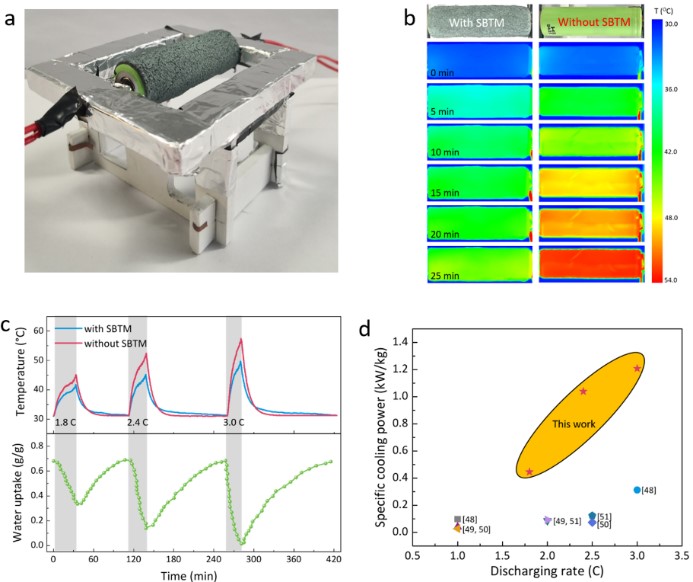 在材料优选、表征的基础上,作者构建了智能电池热管理演示装置。通过与空电池的对照实验对比发现,采用了智能电池热管理的18650锂离子电池可以获得最高8.3℃的降温效果,并使电池温度控制在45°C以下。受益于水蒸汽脱附过程的高焓值,电池演示装置仅采用了0.51克MOF材料即可实现单节电池所有焦耳热的吸收,该质量数值仅为电池质量的百分之一,因此具有显著的高能量密度优势。在冬季预热模式下,采用了智能电池热管理的18650锂离子电池获得了5°C的温升效果,使得锂电池获得了更深的充放电效果,容量提升9.2%。此外,作者研究了电池温度和环境湿度对材料脱附速率和吸附速率的影响,结果表明该材料在不同的约束工况下表现出自适应吸附/脱附的工作特性,随着电池温度的升温速率增大其脱附速率增大,随着升温速率的减小其脱附速率降低,因此具备自适应散热功率的实时调控。
