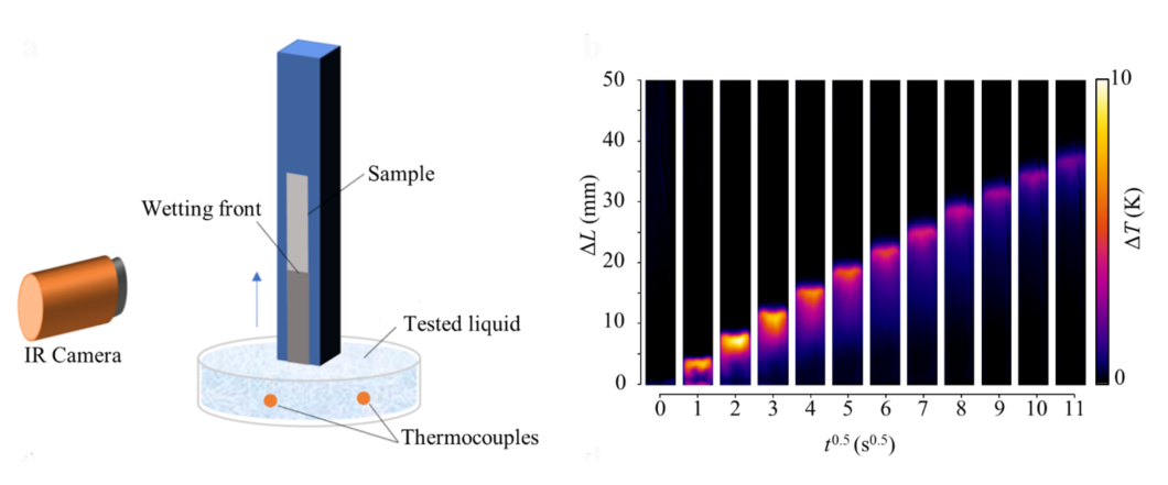 研究将普通打印纸作为基底,通过组装亲水性金属-有机框架化合物薄膜,实现了纤维素基多孔材料毛细吸液能力十倍以上的增强。实验证明在纳米孔尺度的毛细流动现象仍遵循经典的Washburn方程(芯吸距离与时间的0.5次方成正比)。在此基础上,研究提出了一种可以对多孔材料中毛细润湿前缘的瞬态放热量进行原位追踪的便捷方法。由于材料表面的超润湿性以及主客体相互作用,水溶液在试纸中的润湿前缘放热温升可达10℃以上。