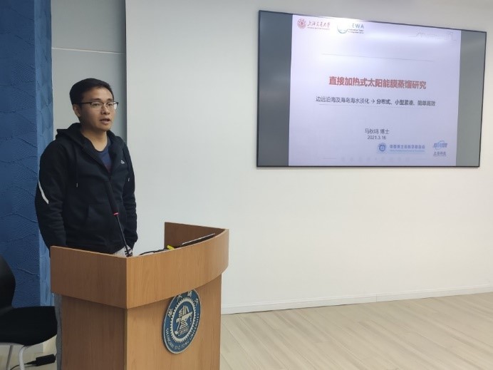 马秋鸣围绕“直接加热式太阳能膜蒸馏研究”,介绍了膜蒸馏的过程和水蒸气跨膜扩散的机理,通过膜蒸馏与太阳能的耦合方式,对其进行稳态建模并与动态循环系统结合实现模拟,提出了系统效率提升和光热膜替代的未来研究方向。