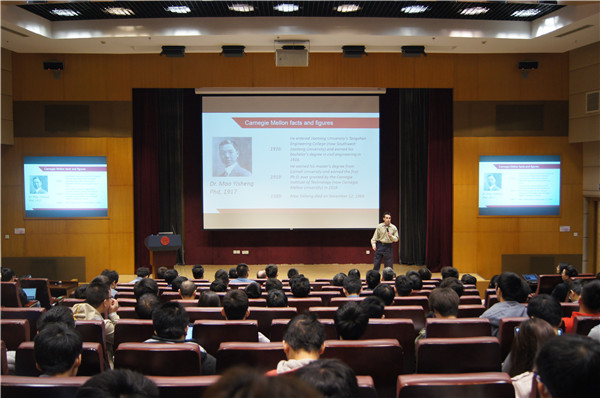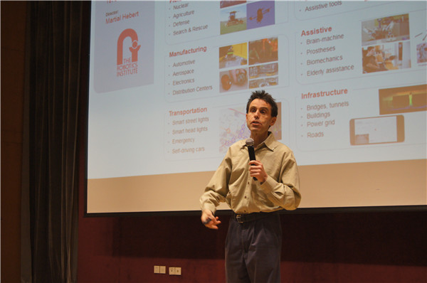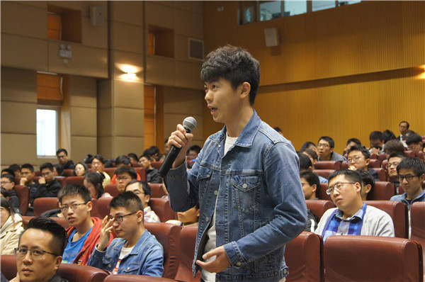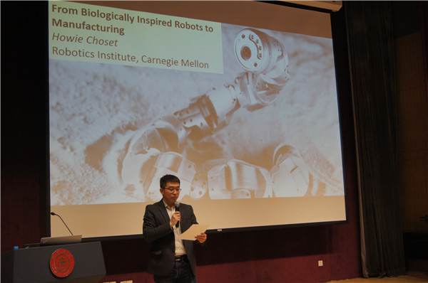 Howie Choset带来了题为“From Biological Inspired Robets to Manufacturing”的报告。他介绍了蛇形机器人在地震施救,管道检测中的应用,讲解了仿生机器人的设计理论并着重分析了模块化机器人、柔性控制理论、群体控制理论在实际产业化机器人中的应用。与会学生就蛇形机器人在地震施救中存在的障碍、小型机器人的爬墙设计、如何控制机器人运动轨迹、从大学科研到产品产业化之间的距离等问题与Howie Choset展开了热烈的讨论。