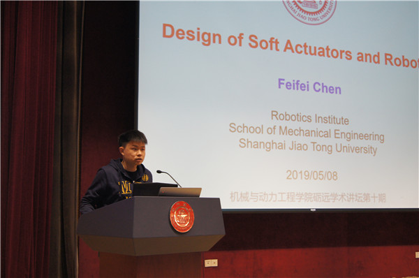 陈飞飞的报告题目为“Design of Soft Actuators and Robots”。他从“什么是软体机器人”引入主题,介绍了如何从大自然模仿学习设计软体机器人,如何利用拓扑优化进行介电弹性体制动器的设计和优化控制以及软体机器爪的设计。自由交流环节,与会学生与陈飞飞探讨了柔性机器人和软体机器人的区别、在软体控制中如何选择反馈指标、如何验证软体机器人的模型是否正确等问题。