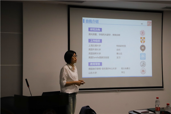 首先由高怡为大家进行分享。高怡先是简单介绍了激光燃烧实验的研究方向、已有成果、人才培养等基本情况,接下来又以“燃烧”为主题进行科普,先是从为什么要高速测量讲起,通过介绍燃烧的相关知识来讲解了燃烧测量的基本原理思路,以及目前燃烧测量的研究成果、研究意义等,这激发了同学们对于燃烧测量技术的热情,在之后的互动环节,部分同学也表达了自己的问题,或者是在结束后和高怡私下交流。