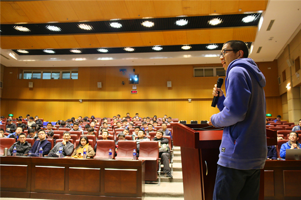 接下来是经验分享环节。首先由经验丰富、曾获院赛亚军的2016级机械与动力学院学生梁帅积极热情而又有条理地给在座同学分享了自己的参赛经验。梁帅同学将机械赛的境界分为五个纬度,从技术层、管理层、艺术层、历史层、世界观层几个层面,条理清晰地将自己的经验娓娓道来。而后曾获校赛冠军的孙愈亮同学上台,从机械传动、电源、电机、电路、主控、通信等更为细致且偏向技术的角度,幽默大方地与同学们分享了自己的比赛心得。两位学长展现了自己的风采,给了同学许多建议和帮助。