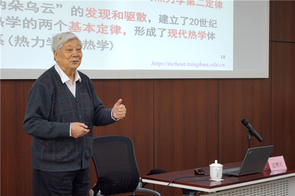 在主题报告环节,过增元院士带来了题为“热学中的两朵乌云”的精彩报告。他深入浅出的带领师生回顾了物理史、现代物理学、热学史和现代热学发展过程中待攻克的难题。他特别提到,钱学森学长曾说“科学创新的思想火花通常来自不同事物的大跨度联想”,热学中出现两朵乌云的原因正是过分强调了热学的特殊性,而缺少与其他学科的共性。他鼓励同学们要有质疑精神,要重视学科知识的交叉、用开放的思维进行科学研究。虽然已是白发苍苍的耄耊老人,过院士仍然精神矍铄、声如洪钟,全程站立着为大家讲解,得到了与会师生们的一致好评。