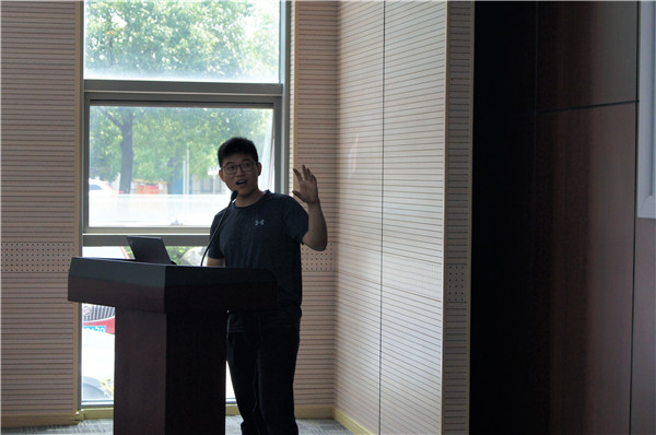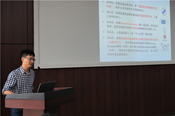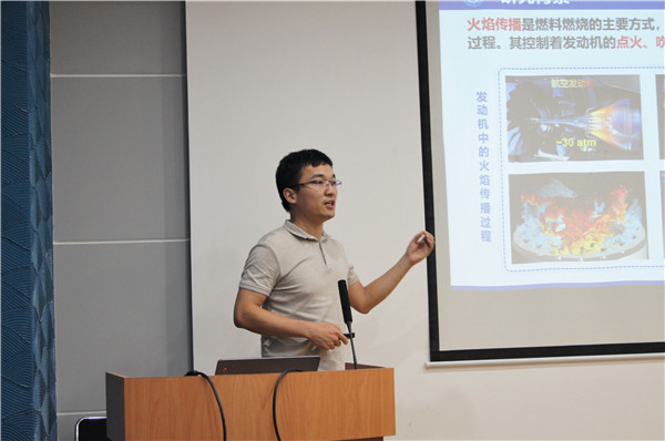 在专家们精彩的学术报告之后,优秀博士生代表、国家奖学金获得者,来自叶轮机械研究所的2017级博士生于涛带来了题为“基于化学发光的火焰三维诊断技术”的学术汇报,重点介绍了火焰发光和化学三维成像技术的分辨率模拟量化与实验方法。他还向在场研究生们分享了自己的科研心得,他表示良好的习惯、适当的娱乐都有助于开展科研工作,鼓励大家平时多看文献、多与导师交流。