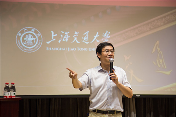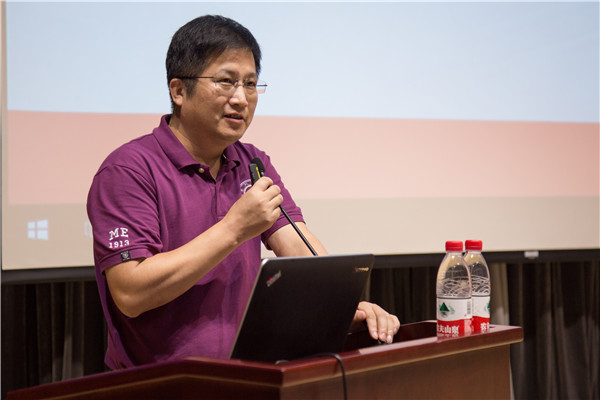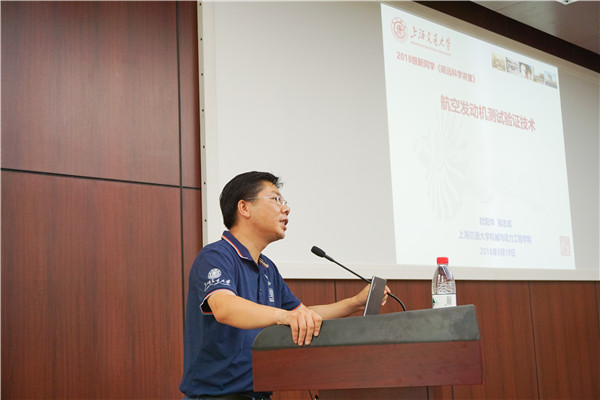 在振华会议室会场,首先由航空发动机专家欧阳华发表演讲,通过航空发动机测试验证技术展开演讲。他首先表示了对新生的欢迎,并由同学们参加过的临港基地航空发动机参观活动开始,引入航空发动机的话题。他介绍了发动机的分类,航空推进技术的发展,航空工业的国民经济,国家工业,国土安全等方面的重要性,以及航空发动机的技术难点。之后他以大风扇为切入点讲解了航空技术难点。随后,欧阳华简要介绍了交大航空发动机研究院及临港研究基地,阐述了学院重视学生动手实践能力和人才培养的出发点,最后用肖志成学长的经历激励同学们投身科研并欢迎同学们加入机动大家庭。