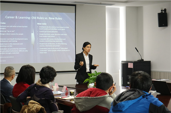 随后, Maria Mora Vinueza从当今职业发展的新定义角度出发,指出如今职业发展已经不是传统意义上的概念,个人发展始终贯穿整个学习生涯和职业生涯并且相辅相成。随后,她建议同学们通过参加实习实践总结提升自己,希望同学们能够科学的运用所学知识,创造一个良好的职业发展开端。
