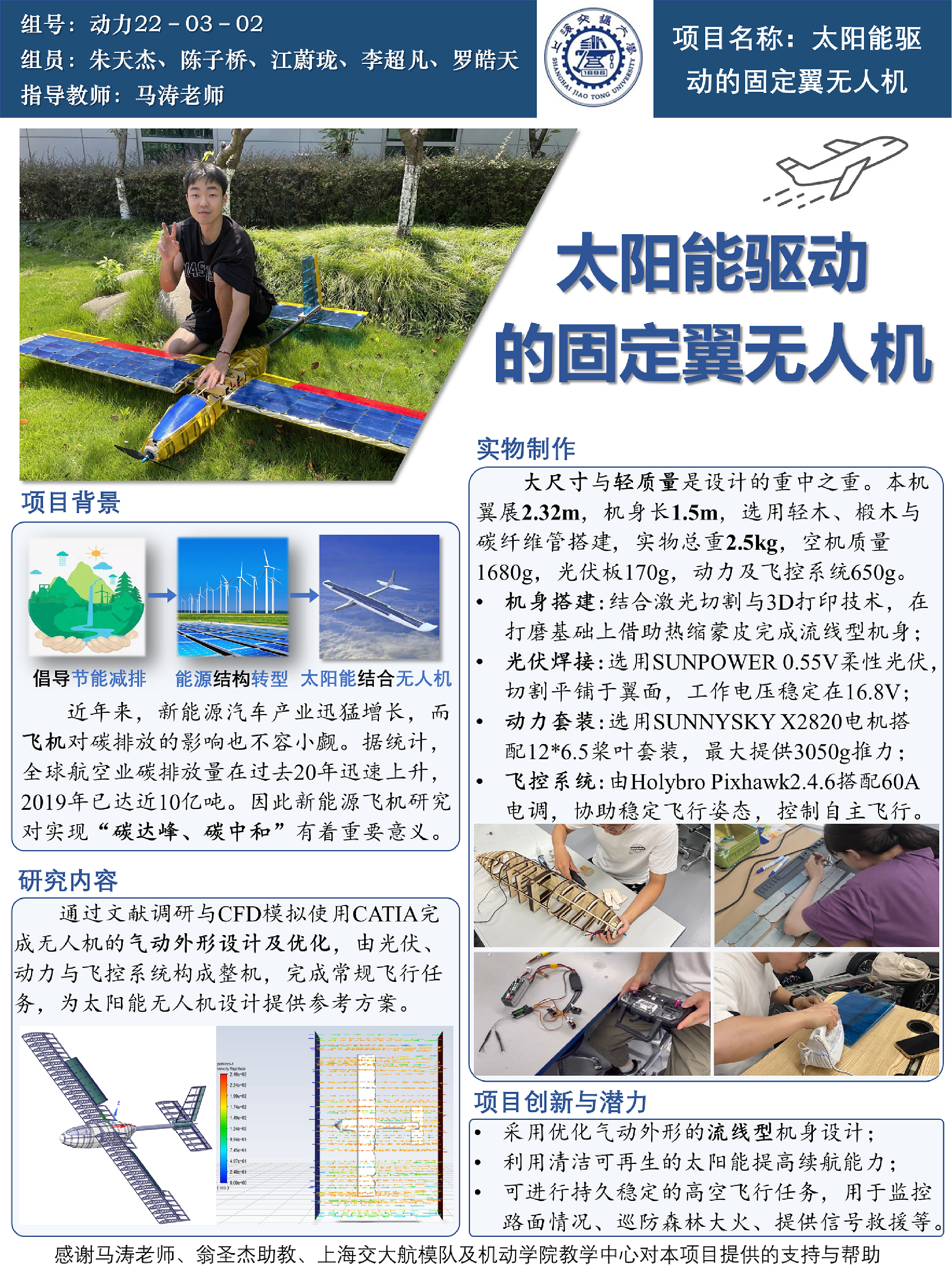 一等奖 | 太阳能驱动的固定翼无人机 | 陈子桥,江蔚珑,罗皓天,李超凡,朱天杰 | 马涛 |