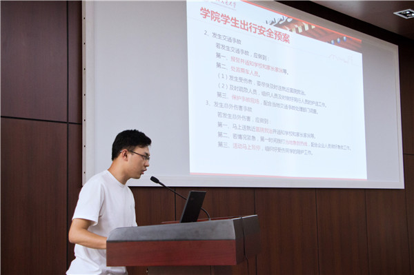 随后,学院职业发展中心辅导员赵航为全体队员进行集体出行安全教育,通过真实的案例切入,使同学们意识到了安全的重要性,提醒同学们做好出行准备、紧急情况预案、每日安全汇报,强调团队统一出行的要求,务必做到安全出发、安全返回。