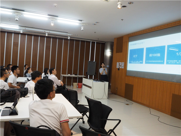 上午10点半左右,实践团到达上海市浦东新区目的地——华为上海研究所。在华为校园招聘经理介绍下,实践团全面了解了华为企业,尤其是上海研究所的发展概况、组织机构、业务范围和人才需求。作为一家世界排名83的全球化公司,华为服务了超过全球1/3的人口。围绕消费者业务、运营商业务、企业业务和云业务这四大核心业务,华为致力于为智能世界使能,“构建万物互联的智能世界”。