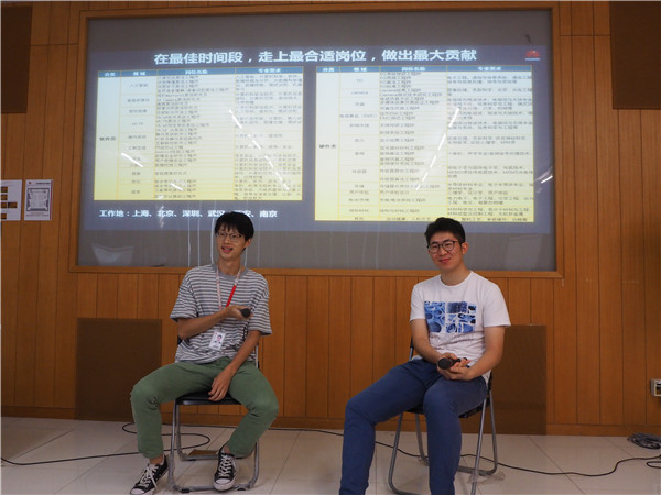 下午,实践团与华为的校友代表开展座谈交流。交大优秀校友刘腾、姜军等人向实践团成员分享了他们的求职经历和就业感悟。其中刘学长介绍了华为公司在通信、材料、机械、AI、算法、人机交互等诸多领域的优势和成就,深情描述了华为将与大家一同迎来的 “大联接时代”,同时讲述了华为研发带给他的工作乐趣和巨大的成就感。校友们将个人的发展与国家重点行业的进步紧密结合,获得个人的成长与幸福感的故事,深深的鼓舞了实践团的成员们,为同学们生涯规划提供了有益参考。