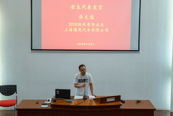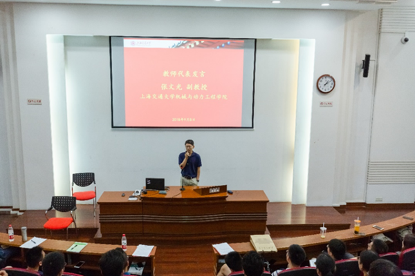 2018级工程管理专业、上海大众动力总成有限公司王志龑作为新生代表发言,他因外祖父毕业于交大而对交大心生向往,为自己也进入交大感到自豪。作为一名新生,他认为应当把握机会,学习新的管理知识,拓展新的思维,结交新的朋友,成为工程管理方面的通才。