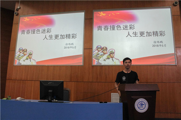 徐炜鹏借南海81192事件引出自己参军的原因,并真情实感地怀念了自己的部队生活,他认为最重要、最宝贵的经历是结识了一批一起奋斗的战友,同一群志同道合的人一起度过两年的军旅生活是他人生中浓墨重彩的一笔。2017级的张胜通过一个精彩短视频向大家展示了军旅中的热血与磨练:文明精神、野蛮体魄,多彩军旅、别样人生,两年美好青春,换一生刻骨铭心。“军队也是一所大学,你会从中收获到极为珍贵的经历”张胜如是说。史凯龙在演讲的开始引出了“大学生活是什么样?”的疑问,他以自身的经历总结出部队教授的人生经验:第一点是优秀,成为优秀,保持优秀;第二点是荣誉,思考全面,眼光长远,凡事拿得起放得下。“心思缜密审时度势,胸怀坦荡敢作敢当,智勇双全以不变应万变”是他的座右铭。