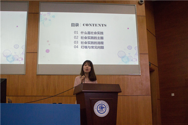 分团委的董颖、温越盈向大家介绍2018年暑期社会实践的基本信息,从“什么是社会实践?”“社会实践的主题”“社会实践流程”“叮嘱和常见问题”等四个方面做了详细的解答。董颖介绍了社会实践的时间轴以及本次社会实践的主题,主题板块主要有国情调研、社会服务、挂职锻炼、科研实践、专项项目五个模块。温越盈向大家强调说明了实践计划、资料保存以及出勤导论课和分论课的重要性,并建议大家在主题选择上要契合主题,并向大家解答了常见的问题。