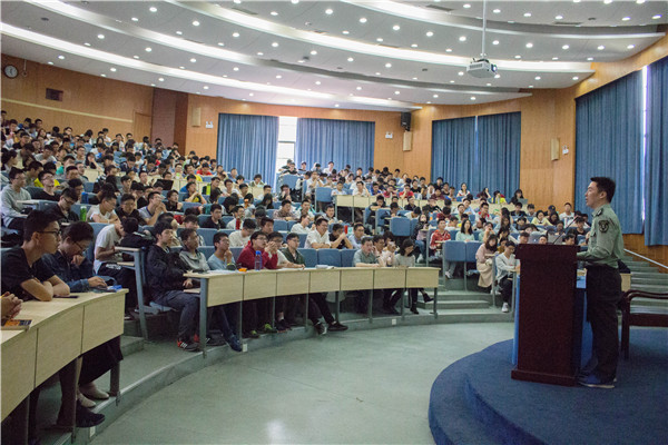 会议伊始,许勇从投身国防、保家卫国,大学生当兵政策,退伍军人优秀群体等几个方面向2017级新生详细介绍了2018年征兵政策以及相关信息,他强调征兵入伍、投身国防是中华人民共和国每一个公民的神圣职责,以交大几位参军的学长学姐为例,向同学们展现了参军对于意志精神力量以及体魄的提升。“热血报国当少年,军旅无悔正青春”,许勇老师激励人心的演讲让现场同学热血沸腾。