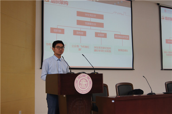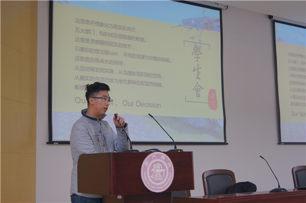 依次由学生科技创新与创业协会、分团委、学生党建联合会和学生会进行宣讲,各个组织通过讲解组织内部的部门、举办的活动、内部成员、内建等方面向大一同学们发出诚挚邀请,鼓励同学在学业有余的情况下,积极投入学生活动,在各方面锻炼自己的能力。